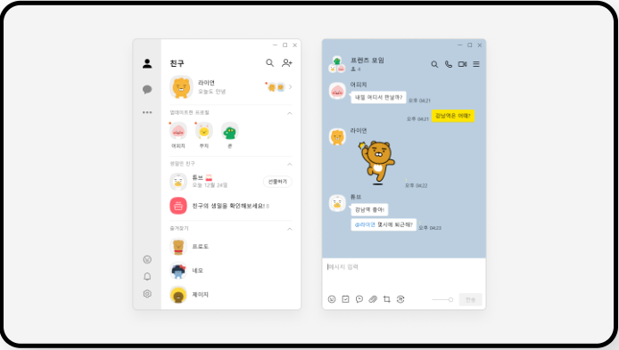 모바일 카카오톡과 실시간으로 동기화되기 때문에, 스마트폰에서 나눈 대화를 PC에서도 그대로 확인할 수 있습니다. 첨부 파일이나 사진도 동일하게 확인이 가능합니다.