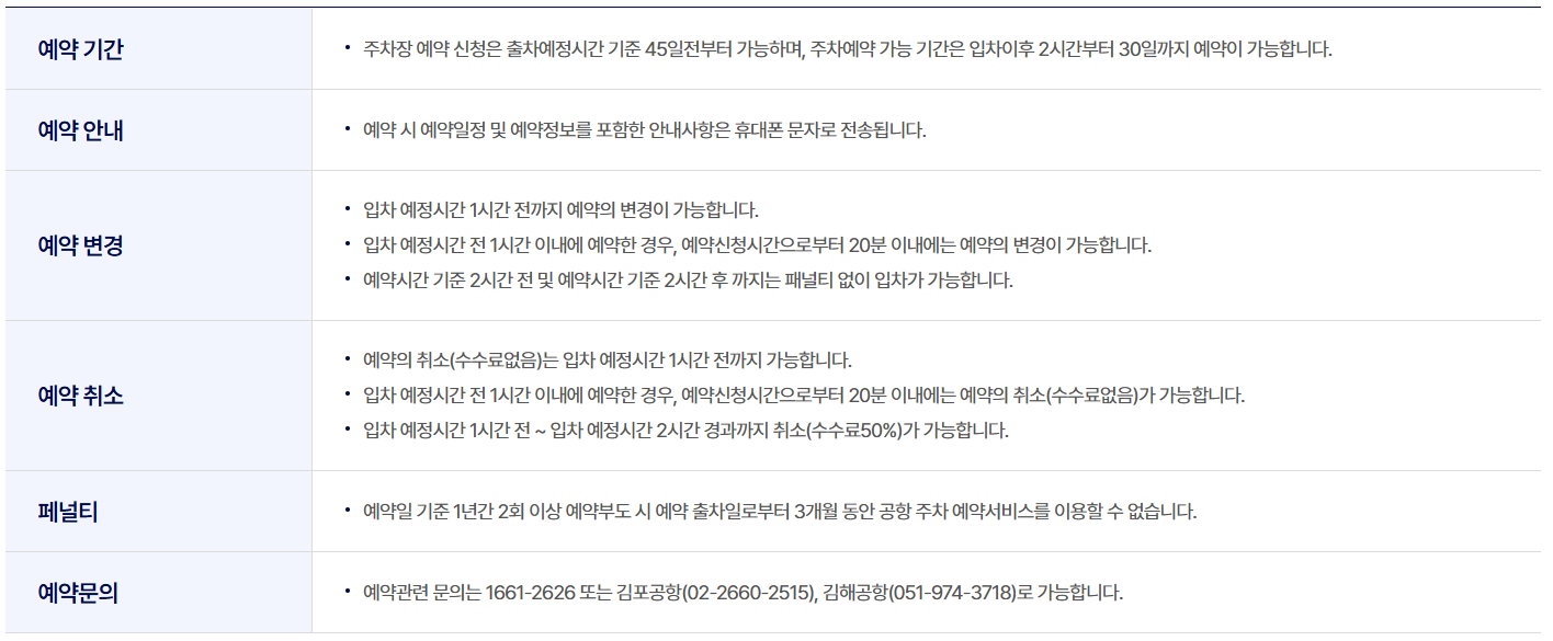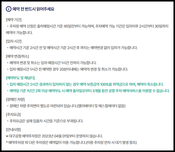 - 김해공항 외에 대구공항은 2023년 4월 1일부터 예약 주차장이 운영되지 않으니 혼동을 피하시기 바랍니다.