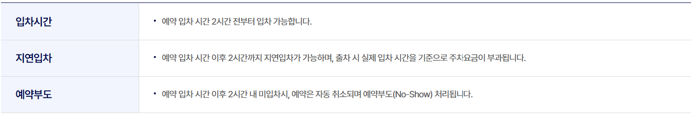 - 예약주차장 외 다른 주차장은 사전 예약 없이도 이용 가능하지만, 만차 시 대기시간이 발생할 수 있으므로 사전 예약이 보다 효율적입니다.