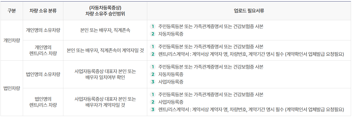 - 차량등록증상의 소유주가 본인 또는 직계존속(신청자 본인, 배우자의 부모)일 경우에만 인정